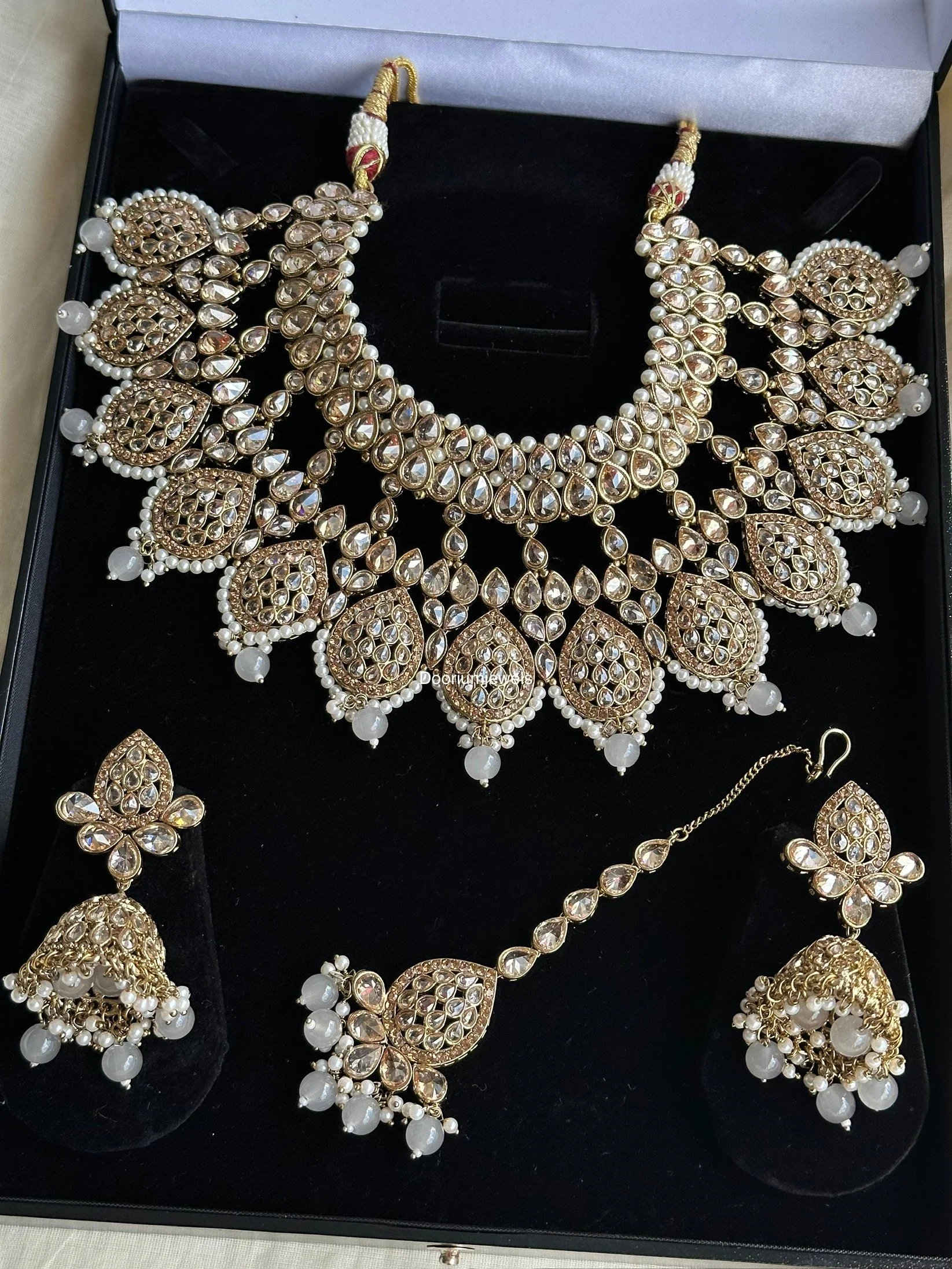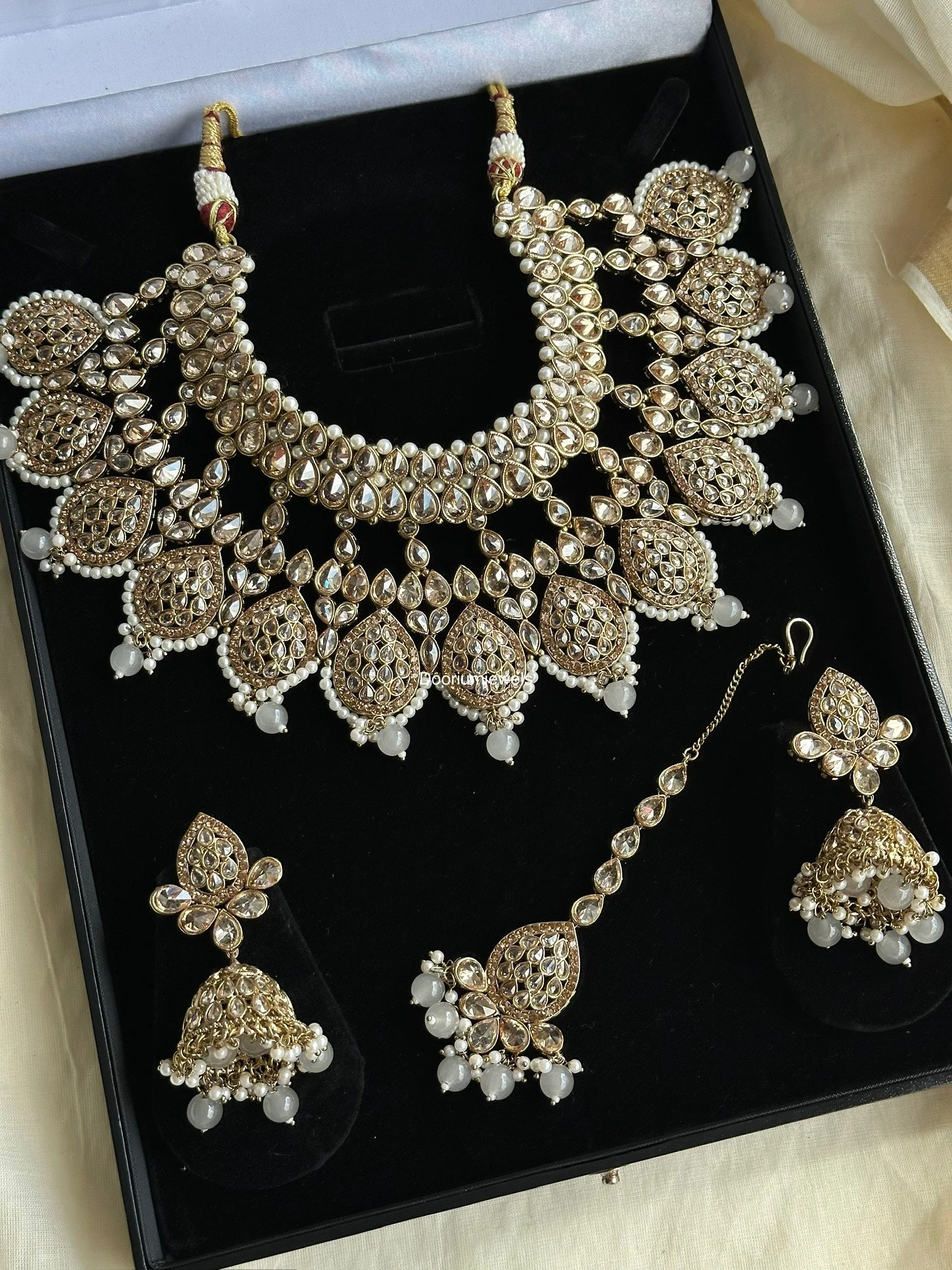 Semi Bridal Polki set with drop earrings and tikka in golden finish with champagne stone setting