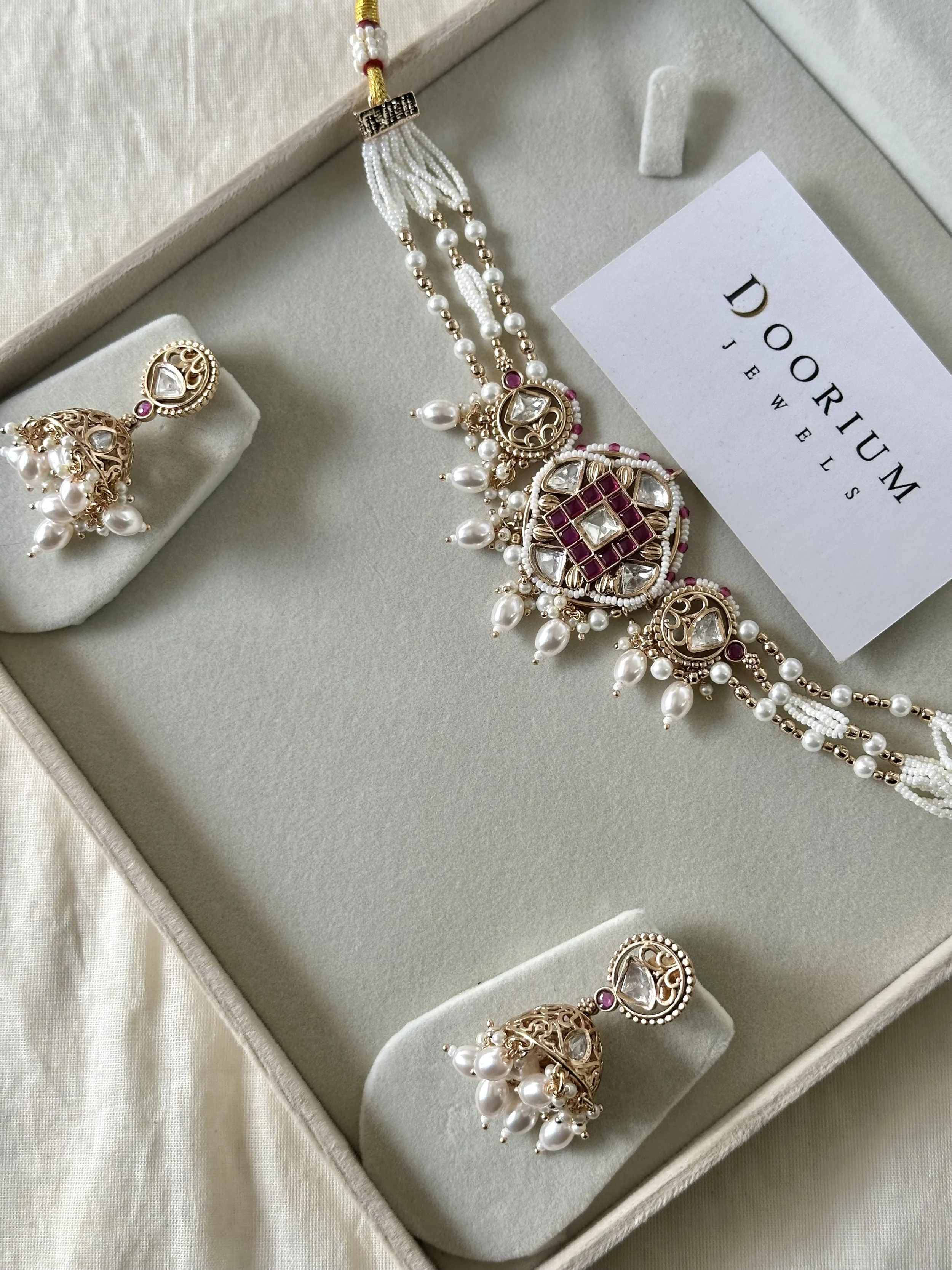 Flexible Paachi Kundan choker with studs and emerald green stone dropping .