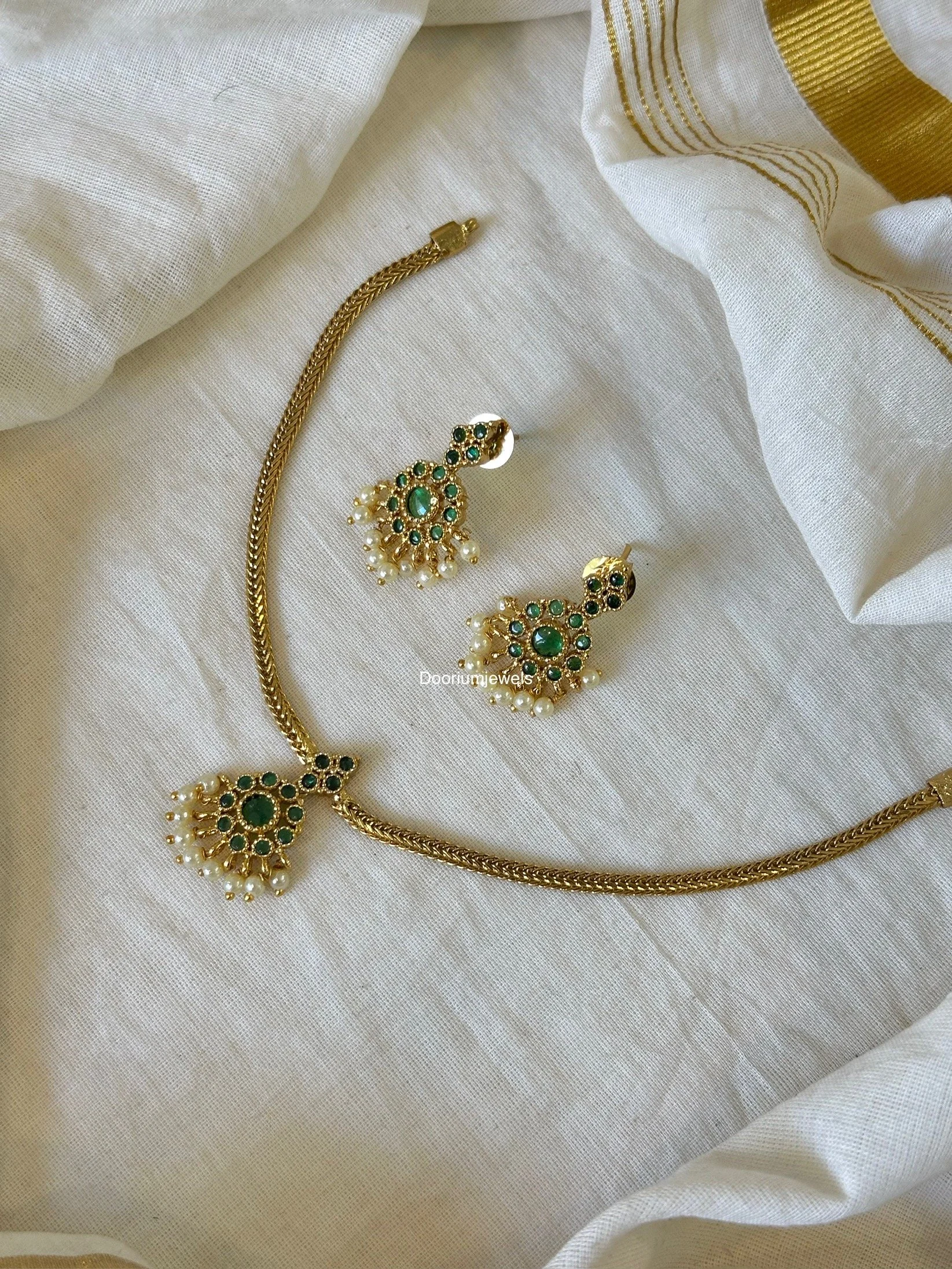 Flexible Moissanite necklace set with green pearl detailing and studs