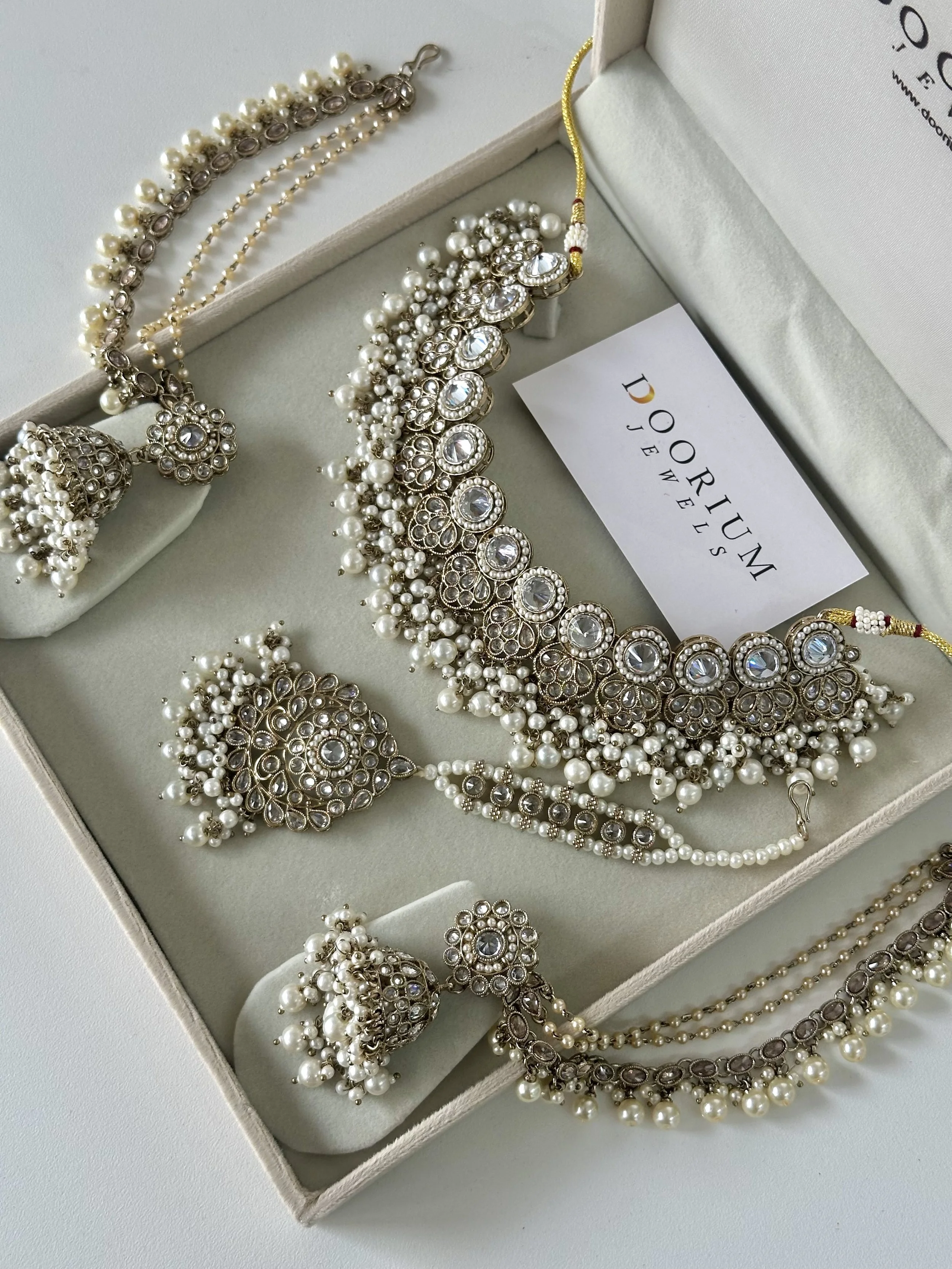 Double layered flexible necklace set with large jhumka and tikka . The set is lined with navy blue pearls.