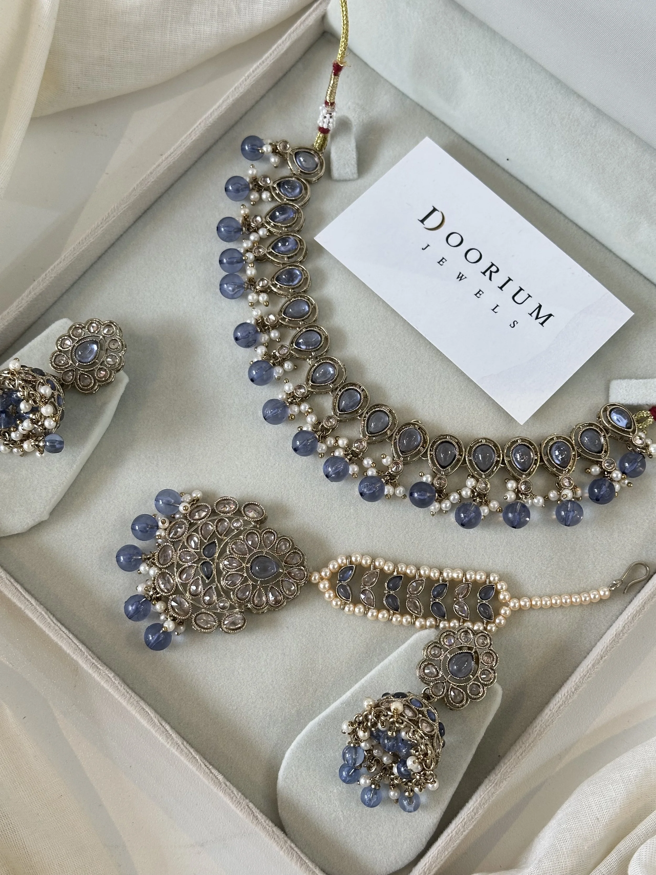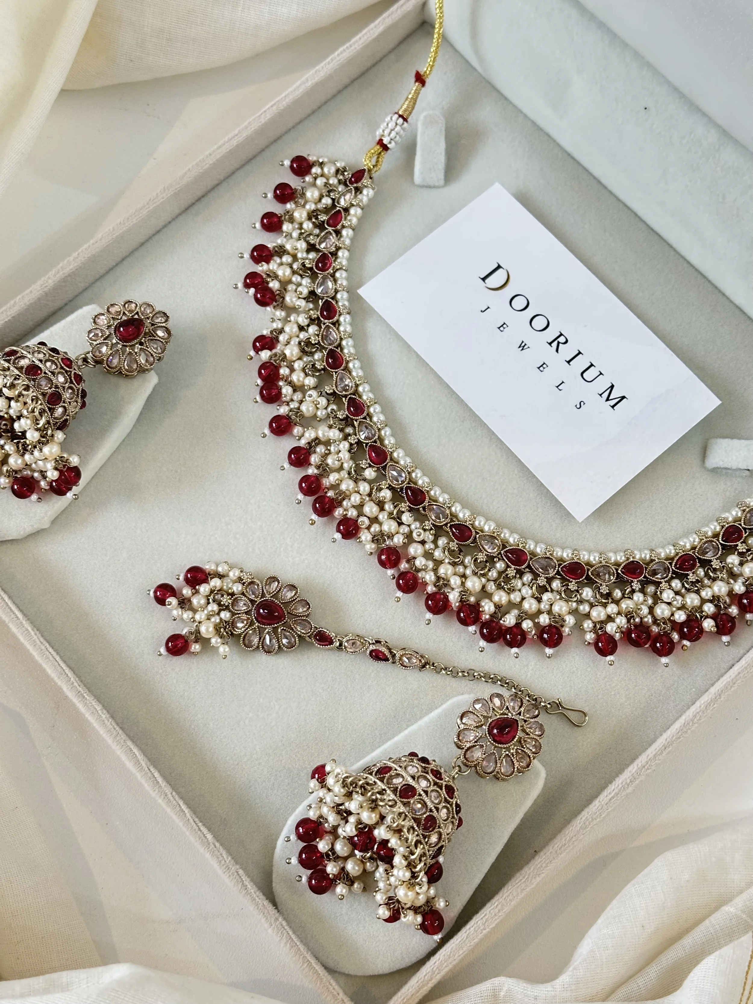 Polki flexible neckakce set with earrings and tikka with maroon beading