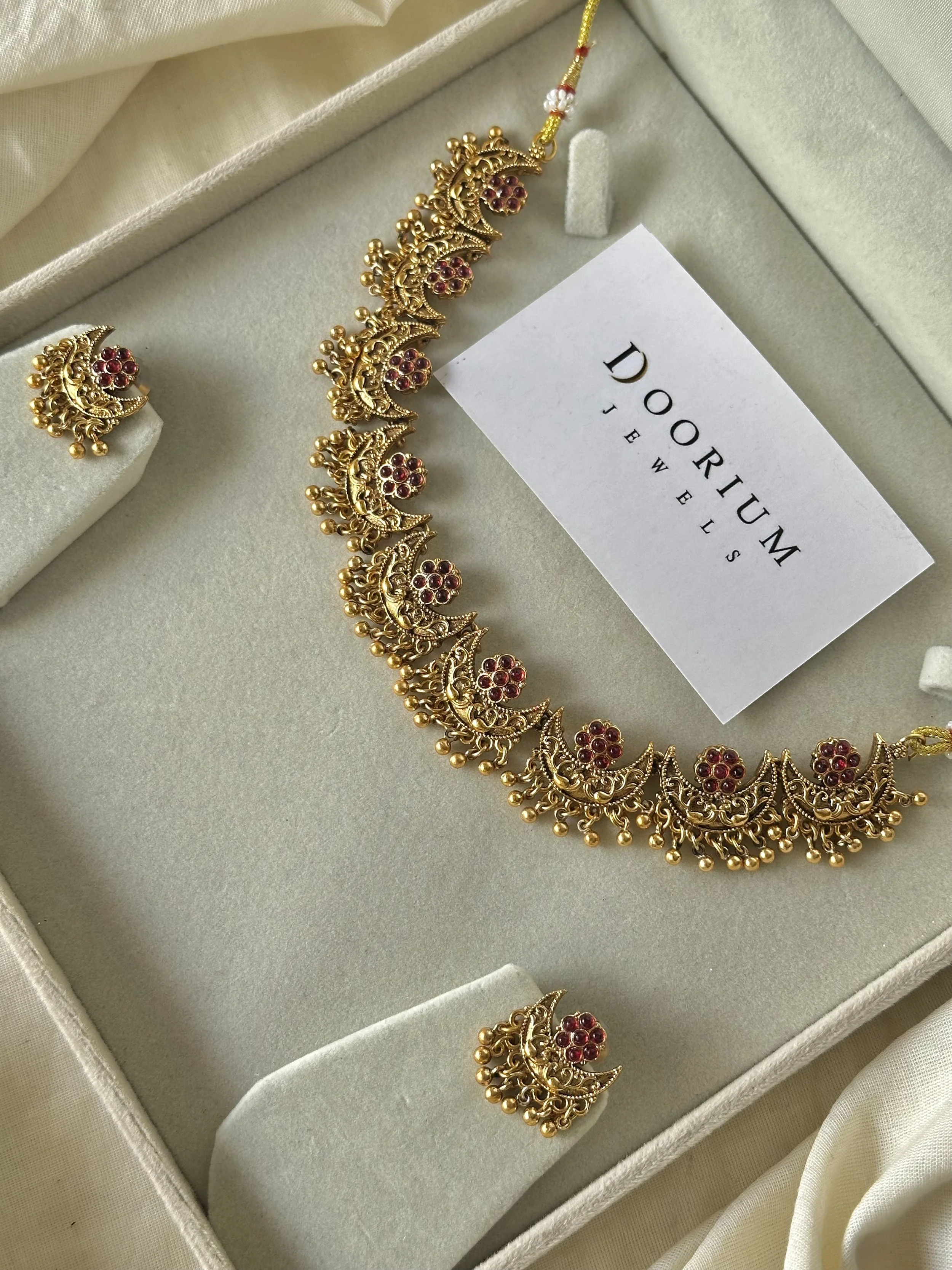 Stunning moissanite necklace set with jhumka . The set is lined with dark maroon beading and pearl detailing with matching tikka
