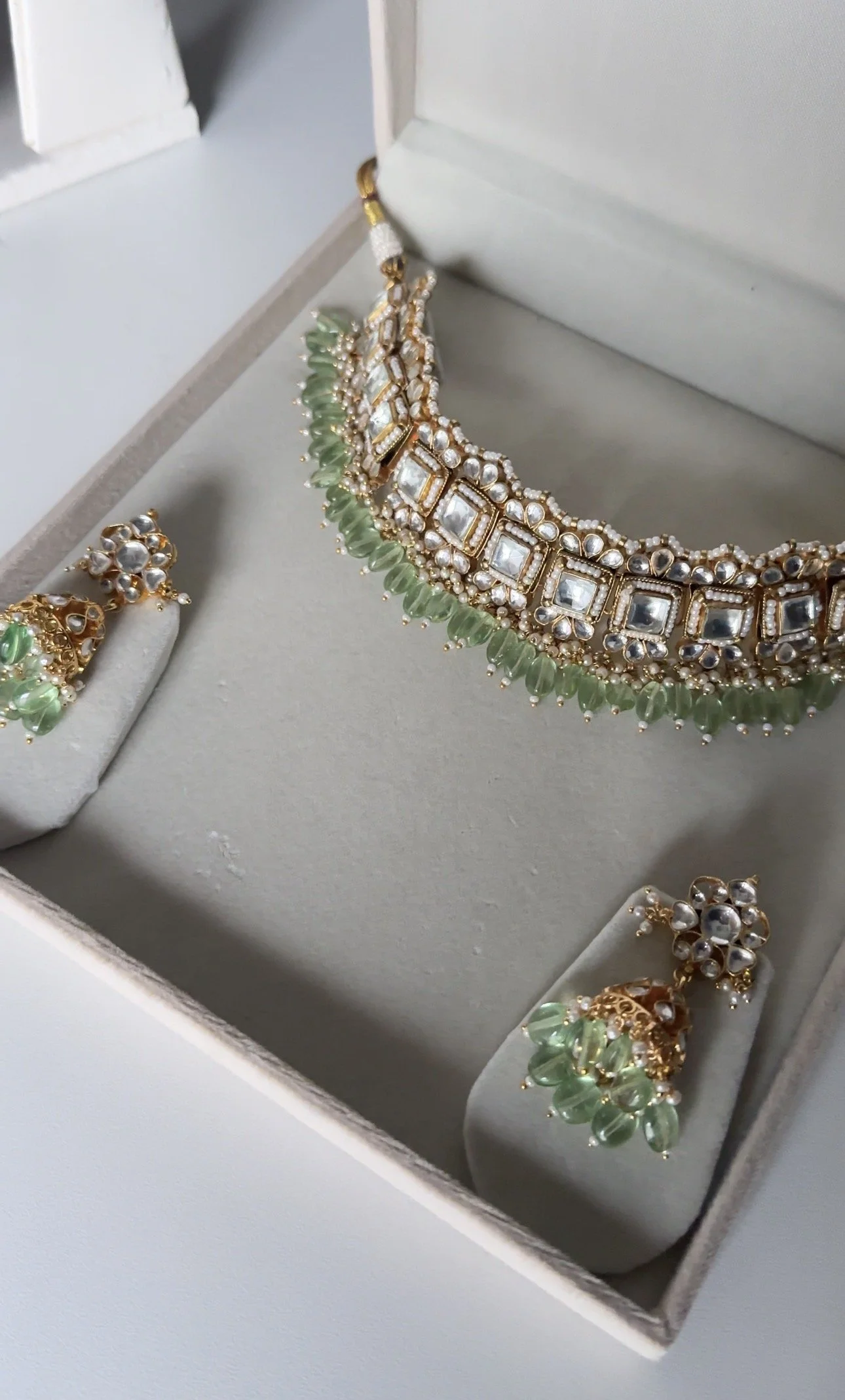 Flexible polki necklace with grey dropping. The set comes with large jhumka with 3 layered earchain attached along with matching tikka.