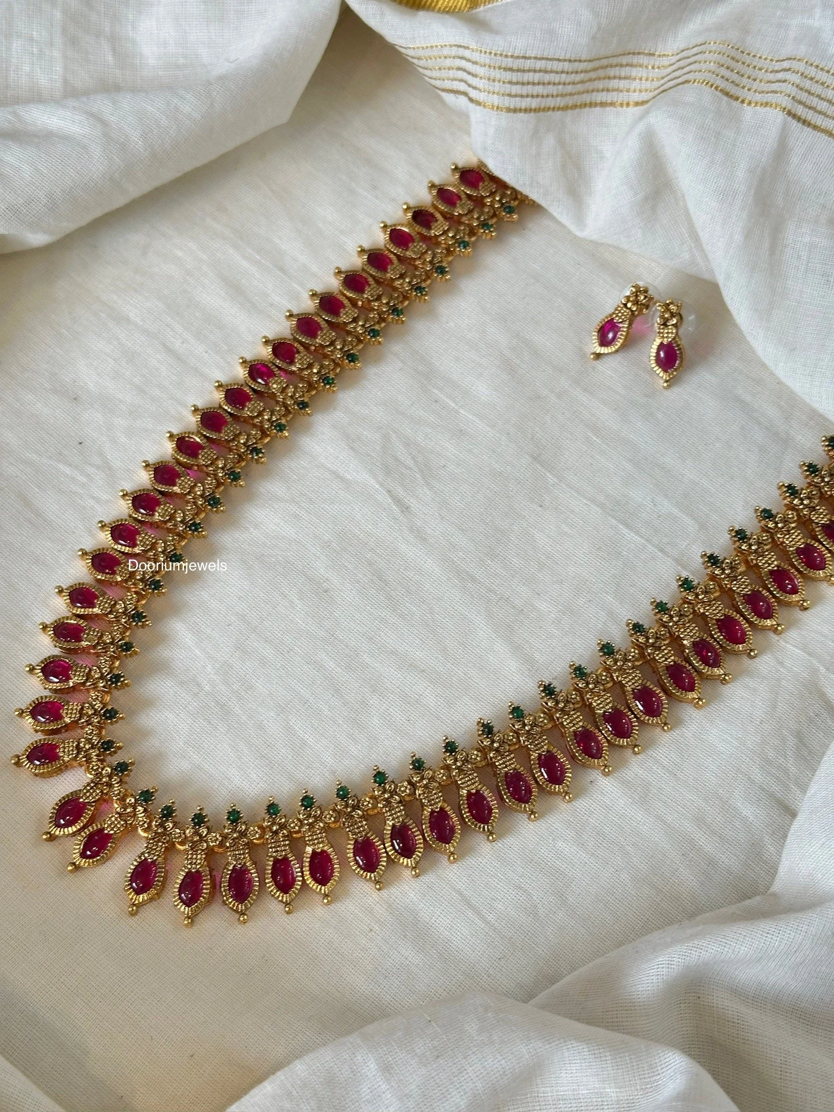 A must have necklace set with intricate beading detailing in gold finish with matching earring and tikka . The sahare is further highlighted with drop beading for added elegance . A cute and simple set to have in your collection